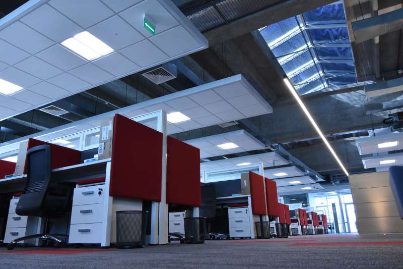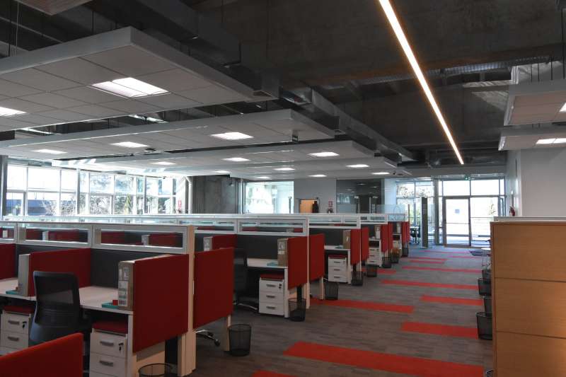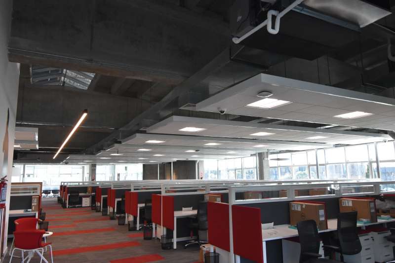 The double height office space has a pre fab reinforced concrete roof with “clouds” hanging from the upper roof. The “clouds” were constructed with linear aluminum frames and acoustic tiles. The design allows flexibility in the future to come, if necessary.