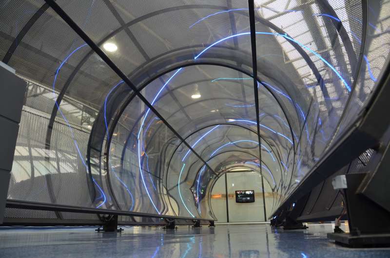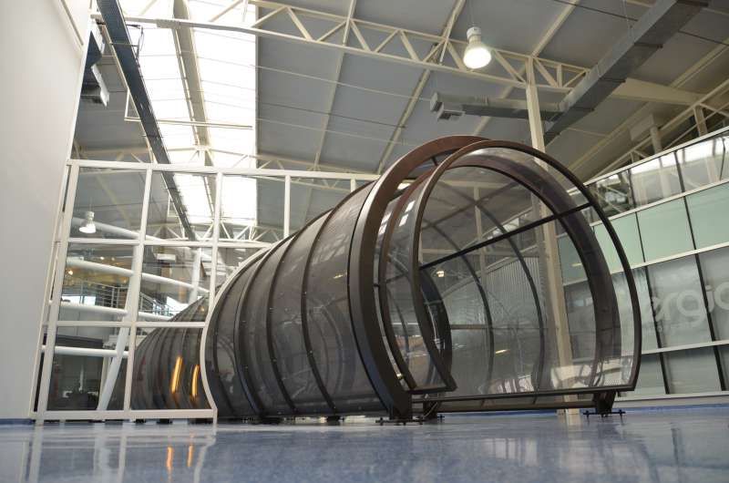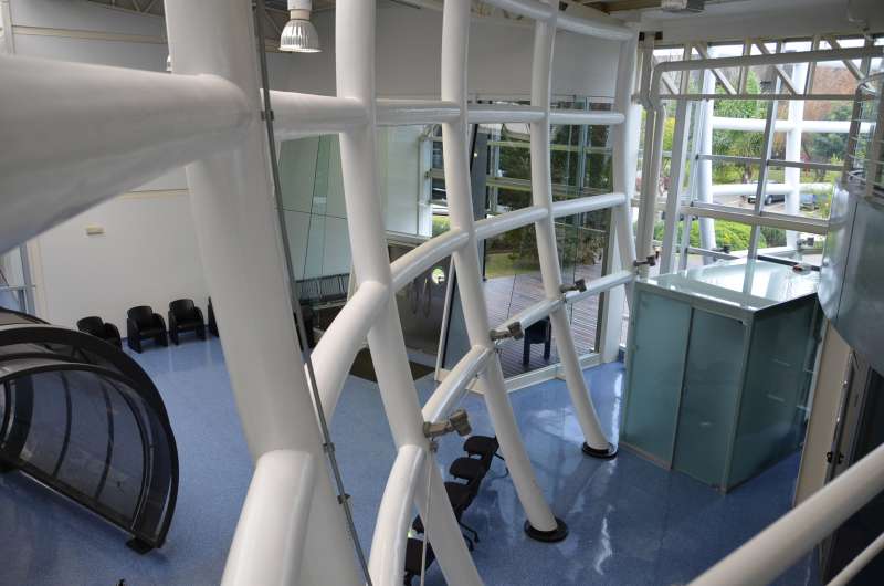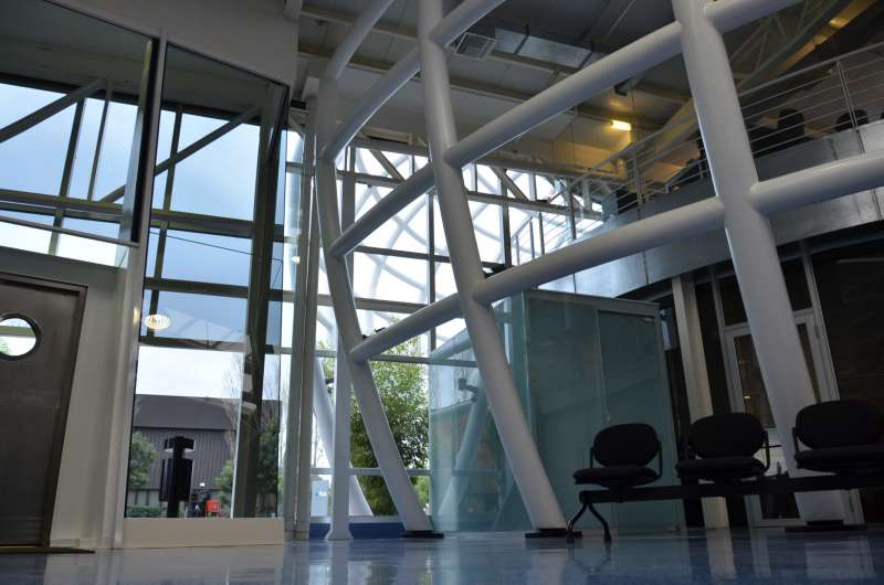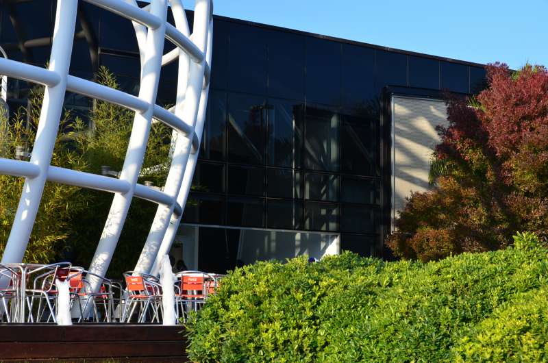 Towards the North of the building, the X Change building contains office facilities. The layout is flexible in order to allow any office to be installed. Apparent structure and transparent common areas help with flexibility and interaction around the main central double-height atrium where a metal tunnel is located at the entrance, just by the main 110 seat conference room. The office floors look into a full-height glazed atrium and external facades. The modular design also allows, in this case, flexibility in this multi tenant building. This part of the building is designed to house or a single tenant or can be easily subdivided to suit multiple occupancy as needed. The atrium responds to the climate and to the quality of light and shade, as well as visual connections to the green areas.