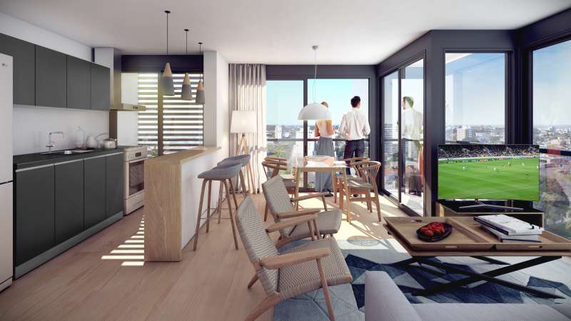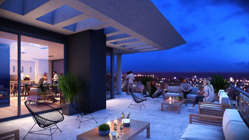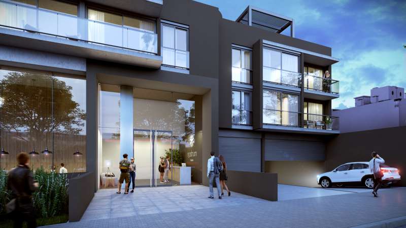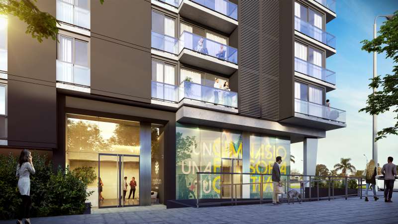 Nostrum Malvín combines a public area on Avenida Italia pedestrian access with the commercial premises and the building’s foyers from the side streets. These two-level accesses and commercial premises are set back inside the base. On these two levels, four levels of apartments reach a height of 16.20 meters.
